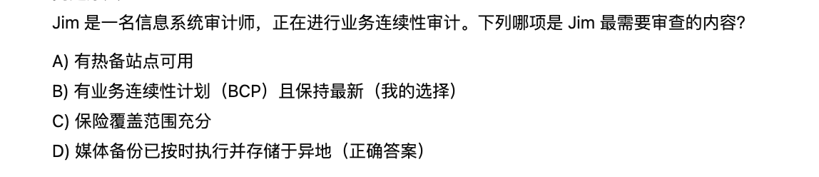 你要从四个选项中对比哪个是“最关键”的。你说得对,BCP 很关键,但这里还有一个更关键的选项,那就是是否存在及时的备份。如果没有选项 D,那你的答案 B 就是对的。