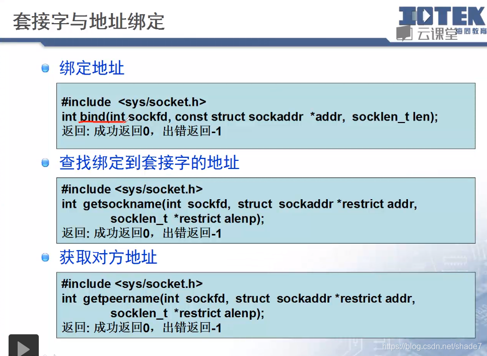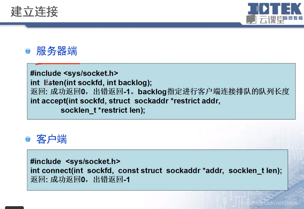 accept 函数用来获得队列中的连接 ,第二个参数是通用路径,用来存放客户端信息,可以为空,意为不获得相关信息,成功返回新的socket描述符,失败返回-1。