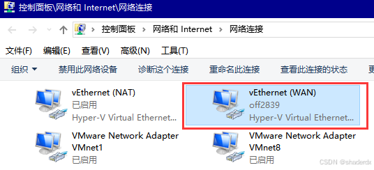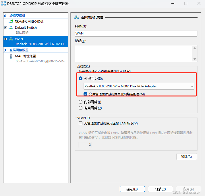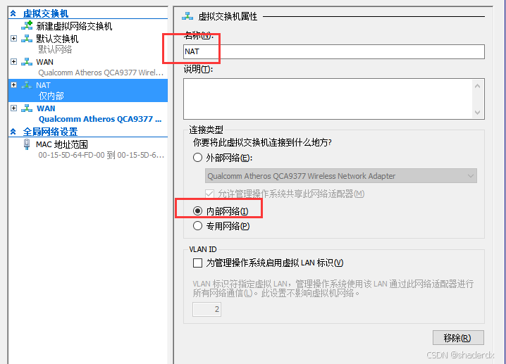 (3)选择在网络桥接式方法中创建的虚拟网卡(WAN),右键-属性-共享,将网络共享给刚才创建的使用内部网络的虚拟交换机(NAT)
