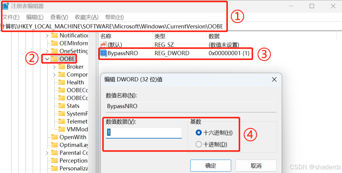 (4)给新建的值重命名为:BypassNRO,双击打开这个BypassNRO这个值,将数值改为1,确定;
