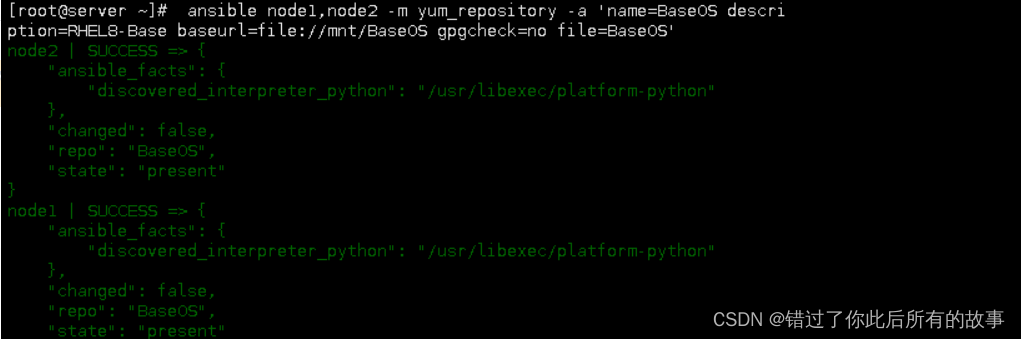 [root@server ~]# ansible node1,node2 -m yum_repository -a 'name=BaseOS description=RHEL8-Base baseurl=file://mnt/BaseOS gpgcheck=no file=BaseOS'