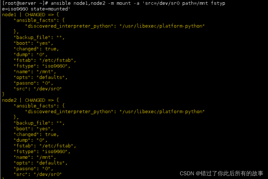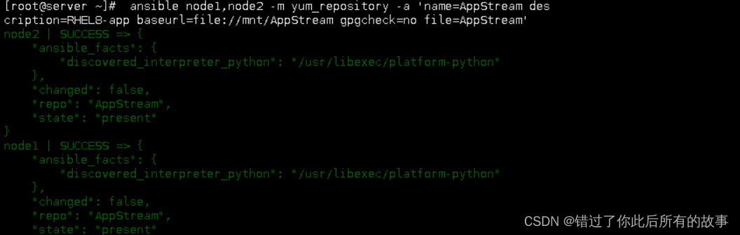 [root@server ~]# ansible node1,node2 -m yum_repository -a 'name=AppStream description=RHEL8-app baseurl=file://mnt/AppStream gpgcheck=no file=AppStream'