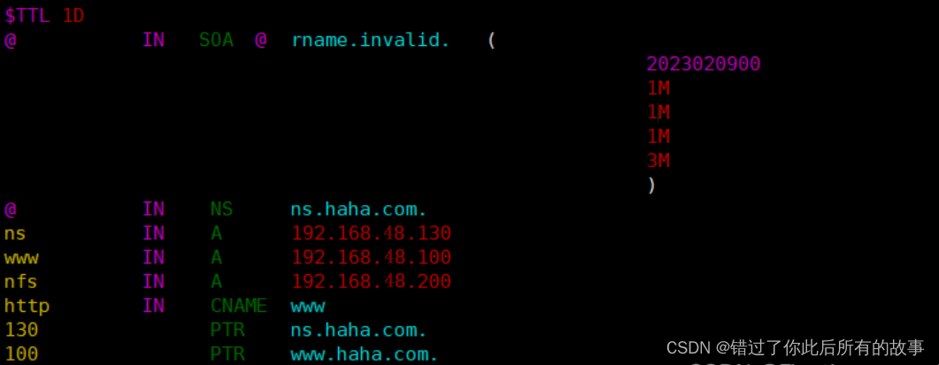 命令:vim /var/named/named.haha.com