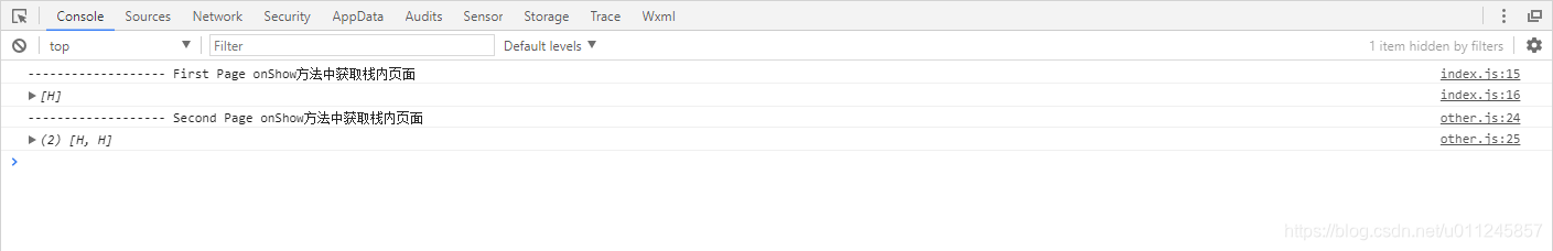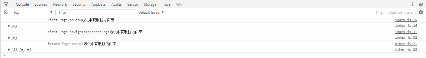 可以看到在 First Page 的 onShow 方法中打印的包含一个对象H的数组, 在 Second Page 的 onShow 方法中打印出了包含两个对象H的数组,H 可以理解为Page实例对象的名称。这和我们预期的是一样的。