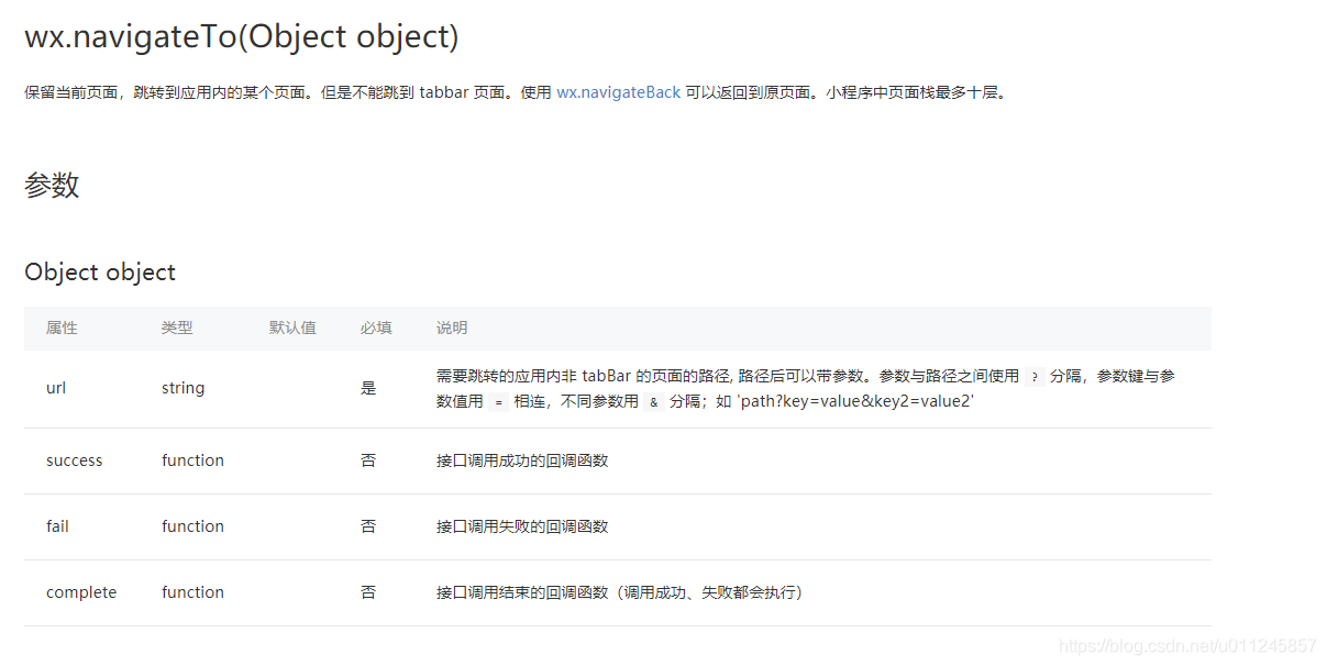 我们仔细阅读 navigateTo 的使用文档就会发现,它除了可以指定跳转路径(url)外,还可以添加三个回调方法。
