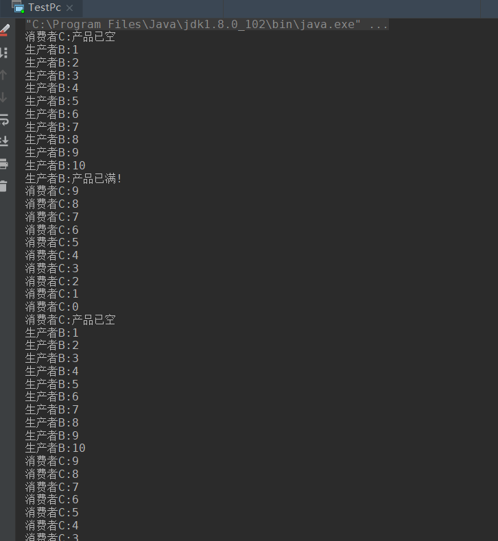 这回结果就比较正常了,为什么使用while就可以呢,因为像上文所说,即使唤醒了所有的消费者线程,此时会不停while循环判断,如果此时条件是为0,那么C哥们就不能出while,那么他也就不回执行下面消费产品的减减操作了,那么就会避免了这种错误。这也是官方提倡的在使用wait 和notifyAll的时候,必须使用while循环条件判断。
