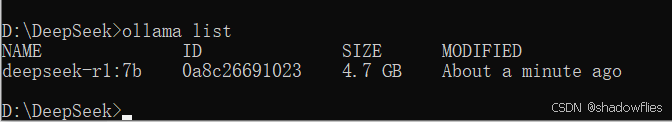 下载完成后输入 ollama list 查看下载的模型,包含模型名称