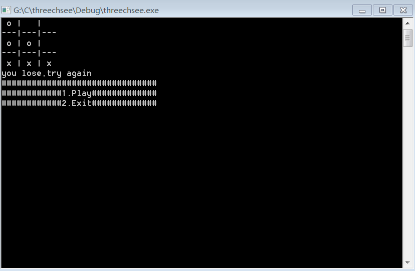 }运行程序,其中x为电脑下的棋子,o为玩家下的棋子,很惭愧输给了电脑,哈哈