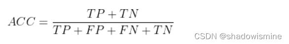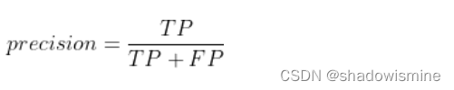 精确度:以预测结果为判断依据,预测为正例的样本中预测正确的比例。预测为正例的结果分两种,要么实际是正例TP,要么实际是负例FP,则可用公式表示: