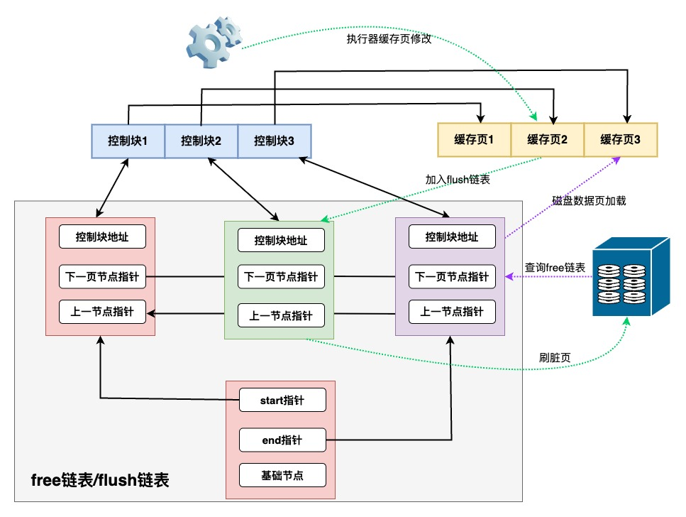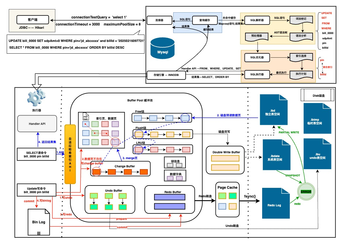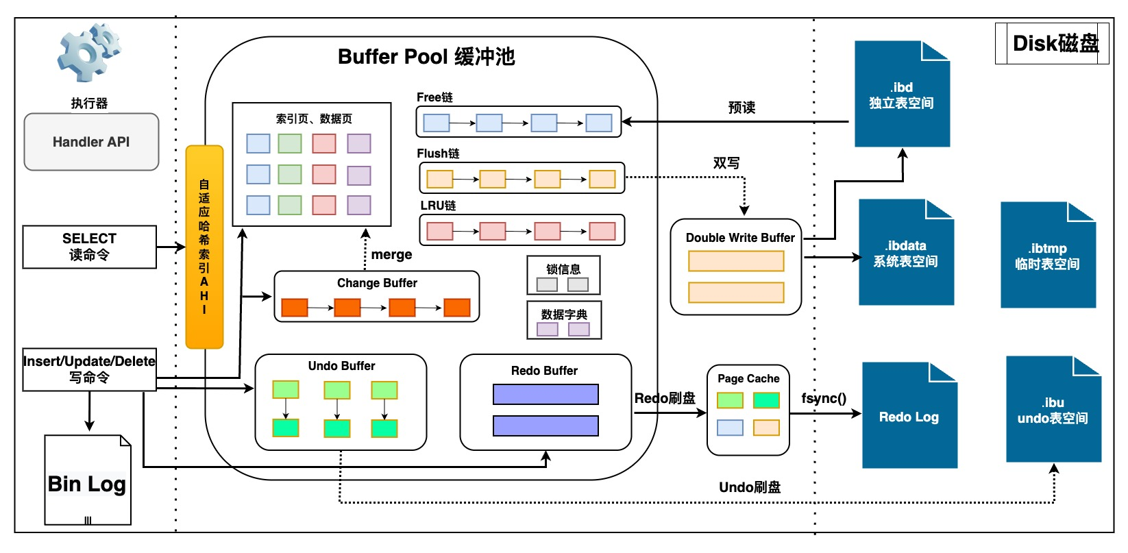 Buffer Pool无对应数据页,则从磁盘加载数据页到缓存中;将数据新值写入Buffer Pool后,由后台IO线程异步刷盘(因为数据页随机IO刷盘耗时较大); - 写入