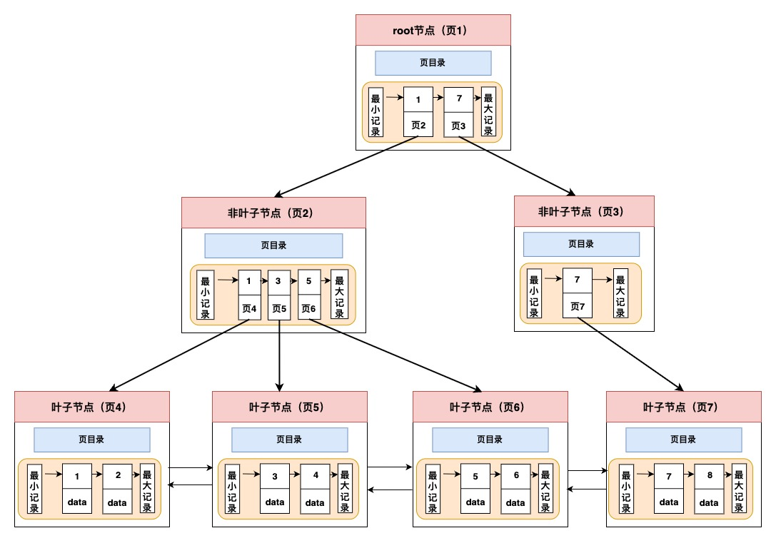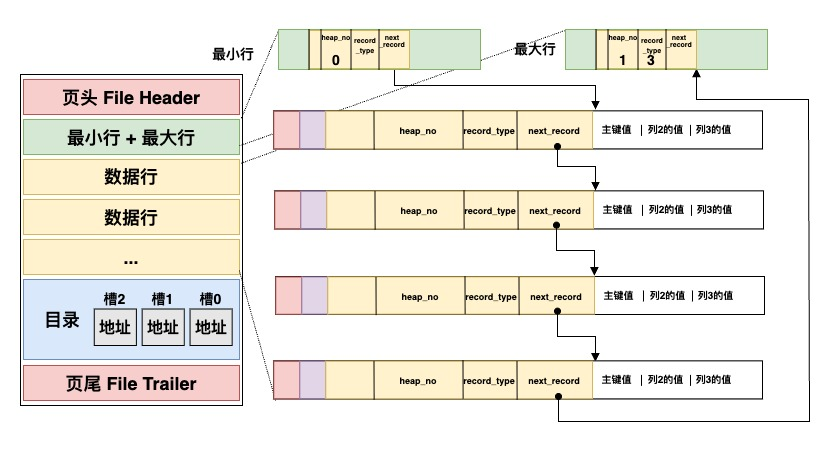 8条数据行构成一个组,行之间由单向链表连接。页目录的槽记录了组内最后一个行在页中的地址,可以做到加速查找:如果定位到了一个页,可以先在页目录中二分查找到在哪一个槽组,然后在组里遍历最多8次即可找到对应的行,复杂度O(log2N)+O(8)。