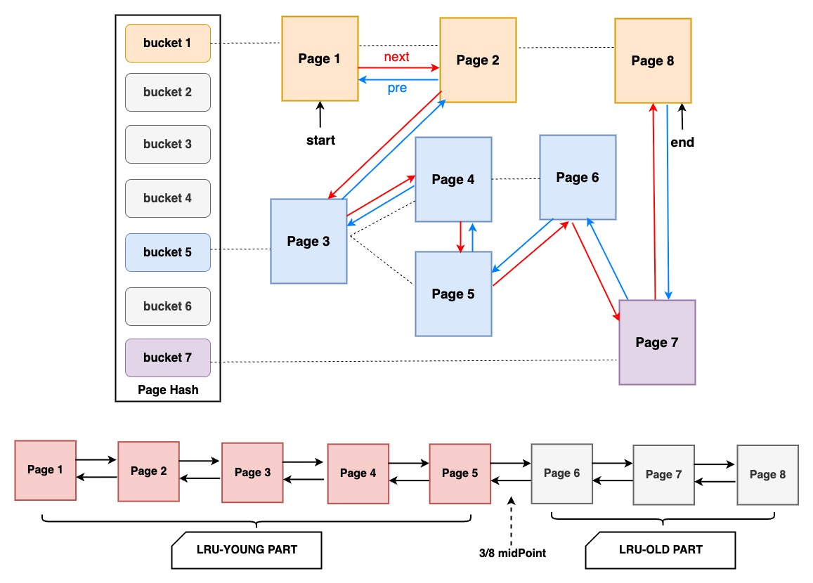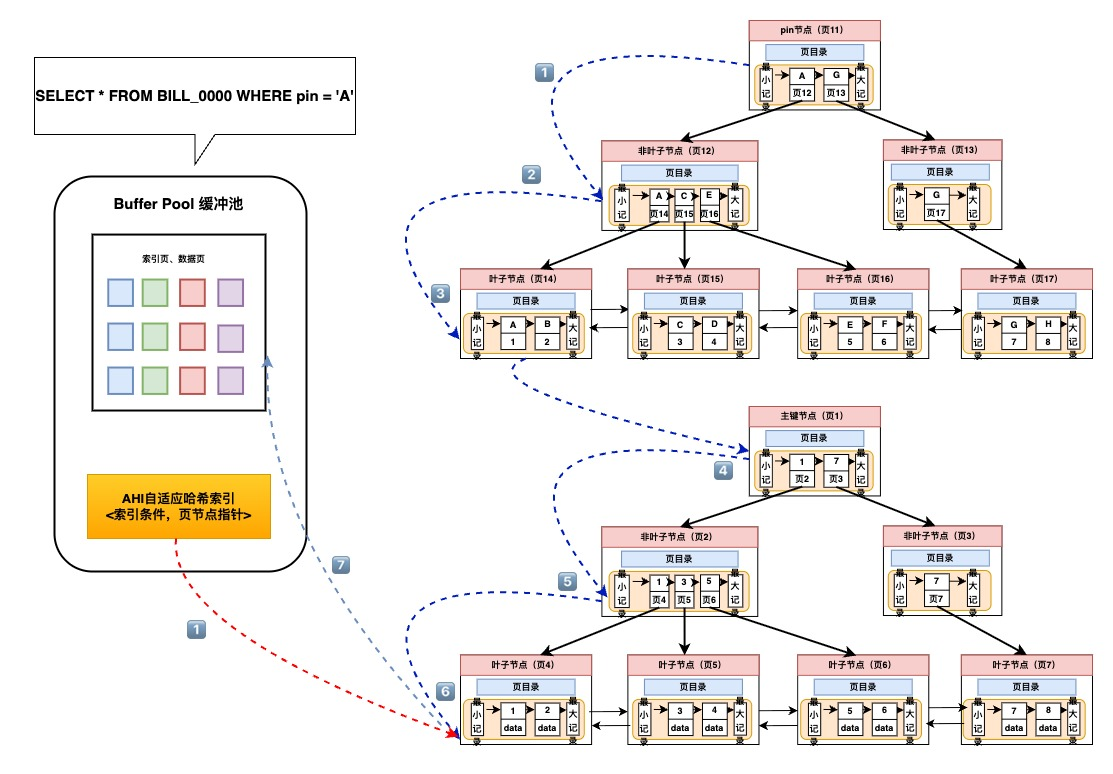 自适应Hash索引AHI:根据数据的使用情况,为热点页建立自适应hash索引。建立在B+树索引上的索引,key=索引条件,value=叶子结点页指针。对于没有hash索引的页,只能回退到从root遍历B+索引树,找到链路上每一层的页号指针,根据页号不断深入查询直至叶子结点数据。