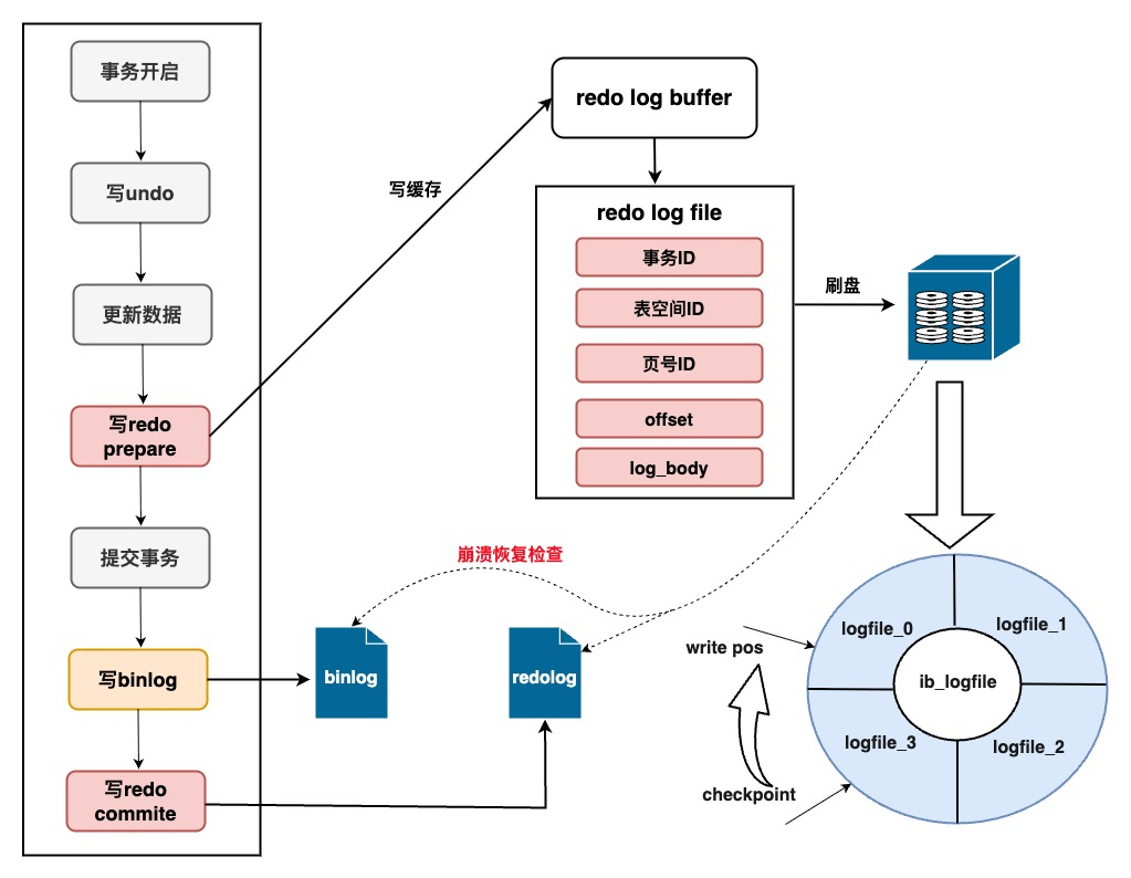 Redo Log Buffer缓存(prepare),并马上写入Redo Log文件,从而可在崩溃时恢复未刷盘的业务数据,实现持久性;且Redo为顺序IO刷盘,耗时很小。