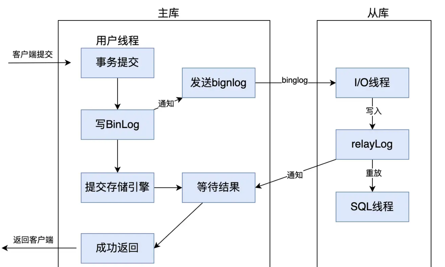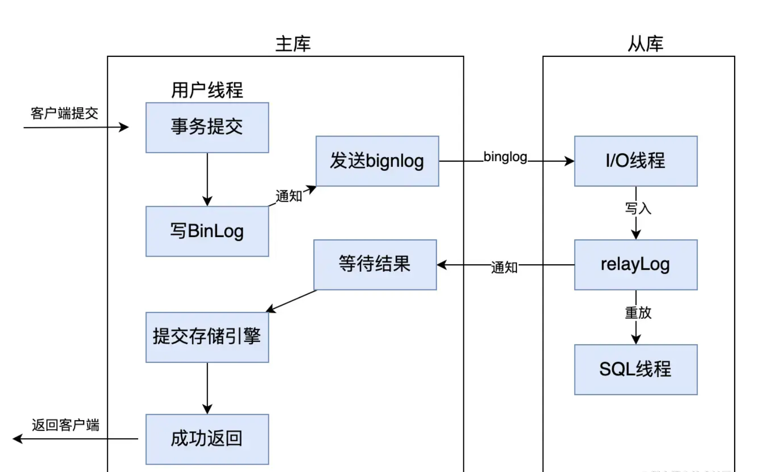 在事务提交时,主库先等待至少一个从库接收并确认bin log,之后才提交存储引擎并返回成功响应给客户端。