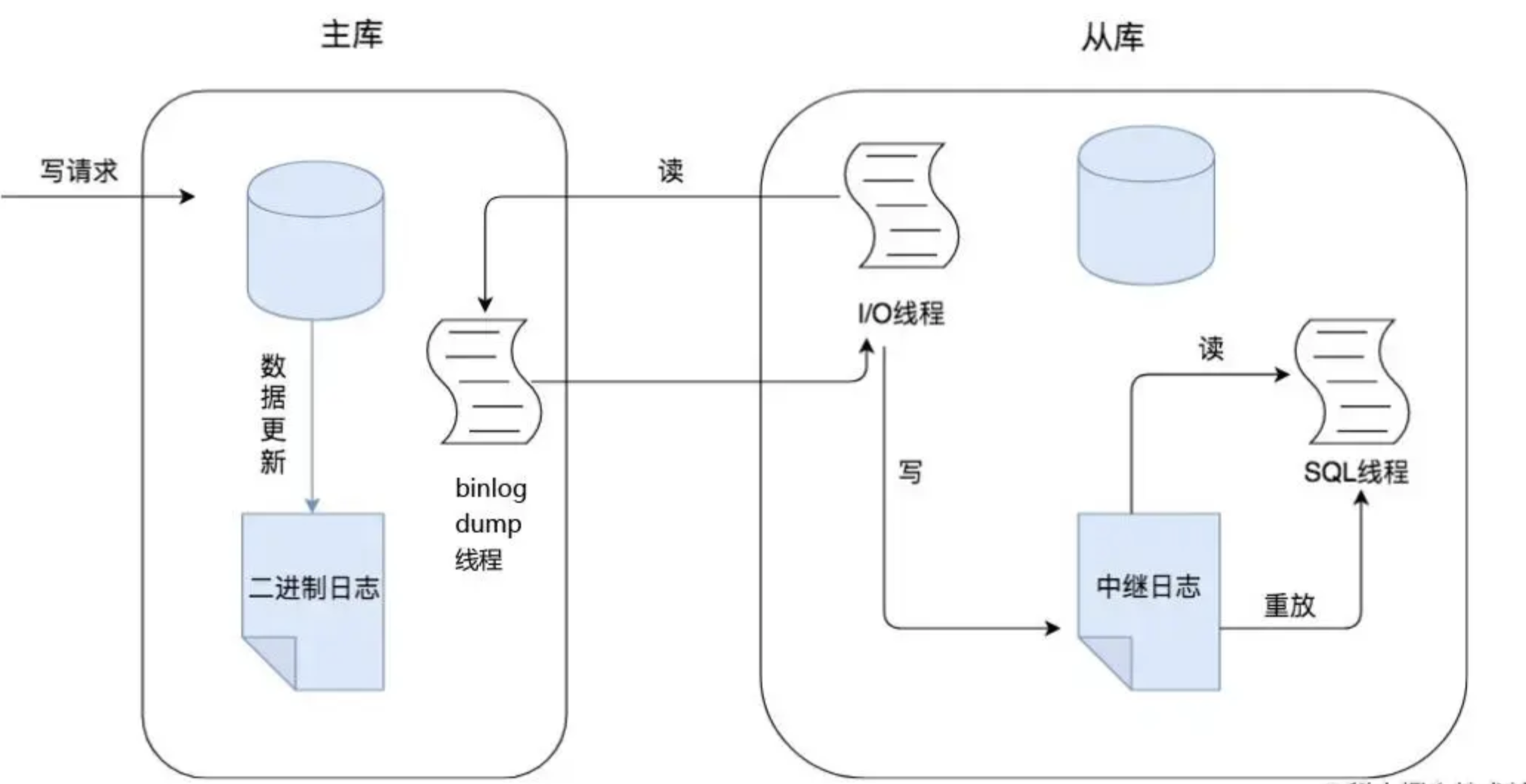 主库在执行写操作后,会将数据更新记录到bin log中,但不会等待从库的响应。从库通过I/O线程异步读取主库的binlog并写入中继日志,再由SQL线程重放这些日志以同步数据。