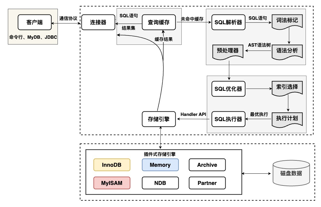 - 服务层负责与客户端建立连接及交互,包括连接器、查询缓存、解析器、预处理器、优化器、执行器等;