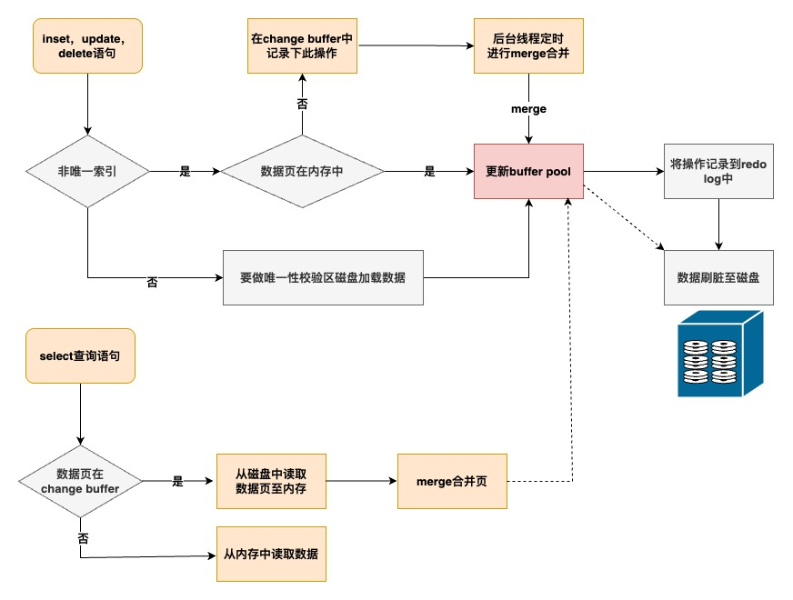 - 查询时若数据存在于change buffer,则需要合并change buffer和数据页