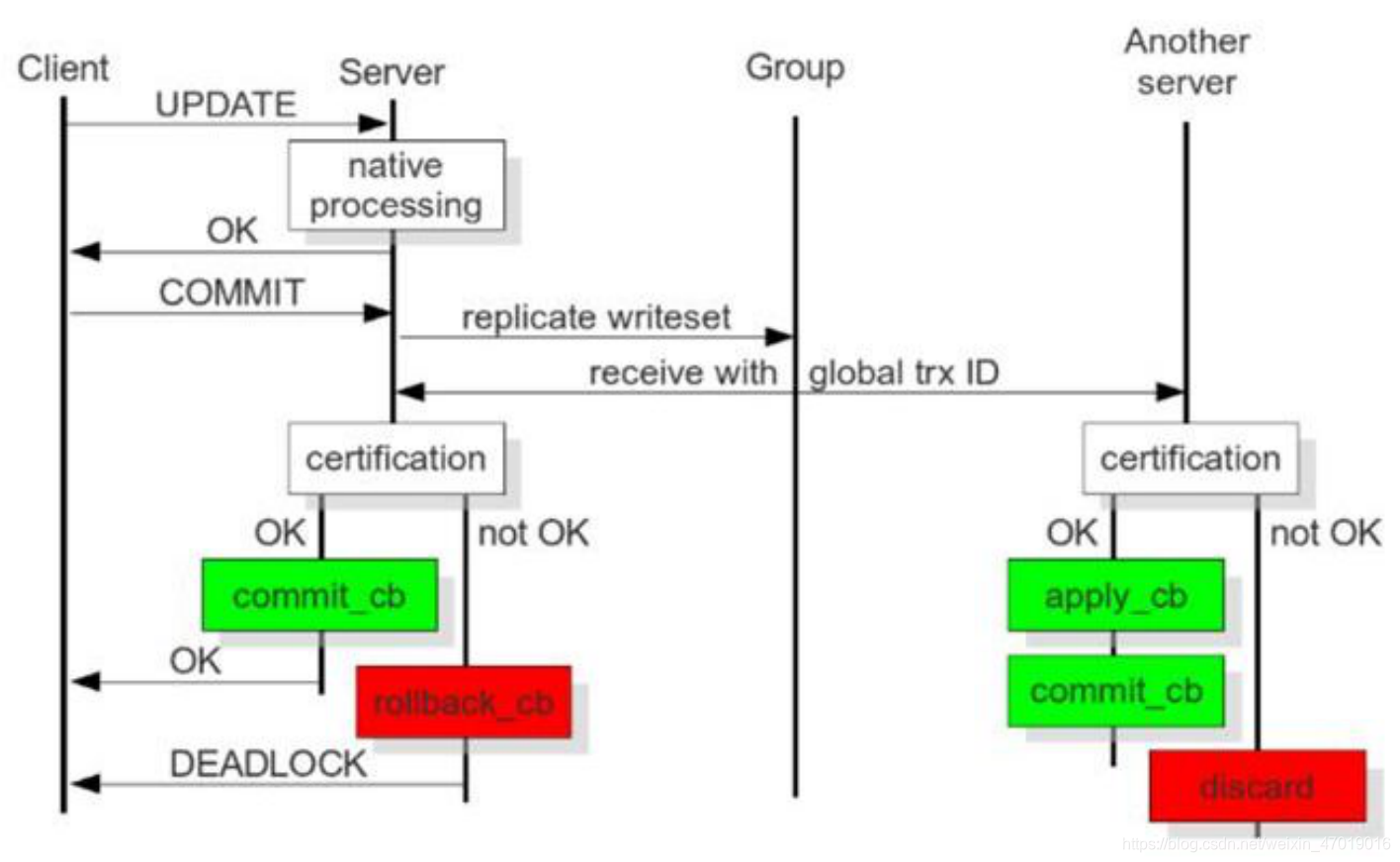 强一致性的多主复制方案。当客户端发起更新请求时,事务会在当前节点处理,随后将写集(writeset)广播到整个集群。每个节点通过全局事务ID和认证机制(certification)检查冲突,只有多数节点验证通过后事务才会提交,否则回滚。