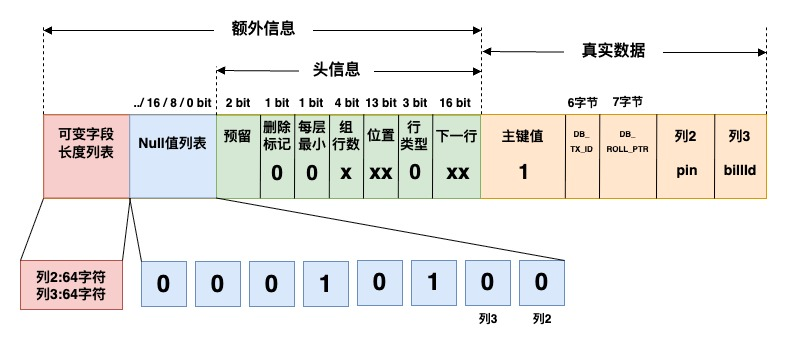 每个列可用1~2字节表示,列字节数为0~255时,占用1字节表示;字节数256~65535时,占用2字节表示。最大可为16bit,2^16可以表示65535字节=16383字符 utf8mb4(Mysql5.7允许的varchar长度上限)。可变长字段太大可能本页放不下,会将字段单独放到一个溢出页。 |