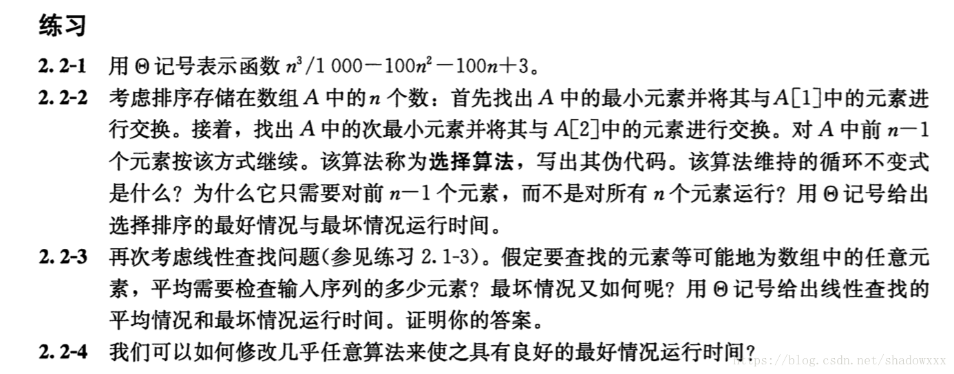 # 2.2分析算法练习题 python描述 # 2.2-1 # Θ(n^3) # 2.2-2 A = [99, 38, 65, 97, 76, 13, 27, 49] # 排序过程 # A = [13, 38, 65, 97, 76, 99, 27, 49] # A = [13, 27, 65, 97, 76, 99, 38, 49] # A = [13, 27, 38, 97, 76, 99, 65, 49] # A = [13, 27, 38, 49, 76, 99, 65, 97] # A = [13, 27, 38, 49, 65, 99, 76, 97] # A = [13, 27, 38, 49, 65, 76, 99, 97] # A = [13, 27, 38, 49, 65, 76, 97, 99] def selectsort(A): length = len(A) for i in range(0, length - 1): min = i for j in range(i + 1, length): if A[j] < A[min]: min = j temp = A[min] A[min] = A[i] A[i] = temp selectsort(A) print(A) # Θ(n^2) #2.2-3 # 假设每个条目都有概率p为元素所寻找的。 然后,如果前面的k-1个位置不是被查找的元素,那么我们将只检查k个元素, # 而第k个位置是所需的值。 考虑到这种分布的预期值,我们可以得到它 #2.2-4 # 对于一个好的最佳运行时间,修改算法首先随机产生输出,然后检查它是否满足算法的目标。 如果是这样,产生这个输出并停止。 # 否则,照常运行算法。 这不太可能会成功,但在最好的情况下,运行时间只会与检查解决方案一样长。 # 例如,我们可以修改选择排序,首先随机排列A的元素,然后检查它们是否按排序顺序排列。 如果是,输出A.否则按照惯例运行选择排序。 # 在最好的情况下,这个修改的算法将具有运行时间Θ(n)。