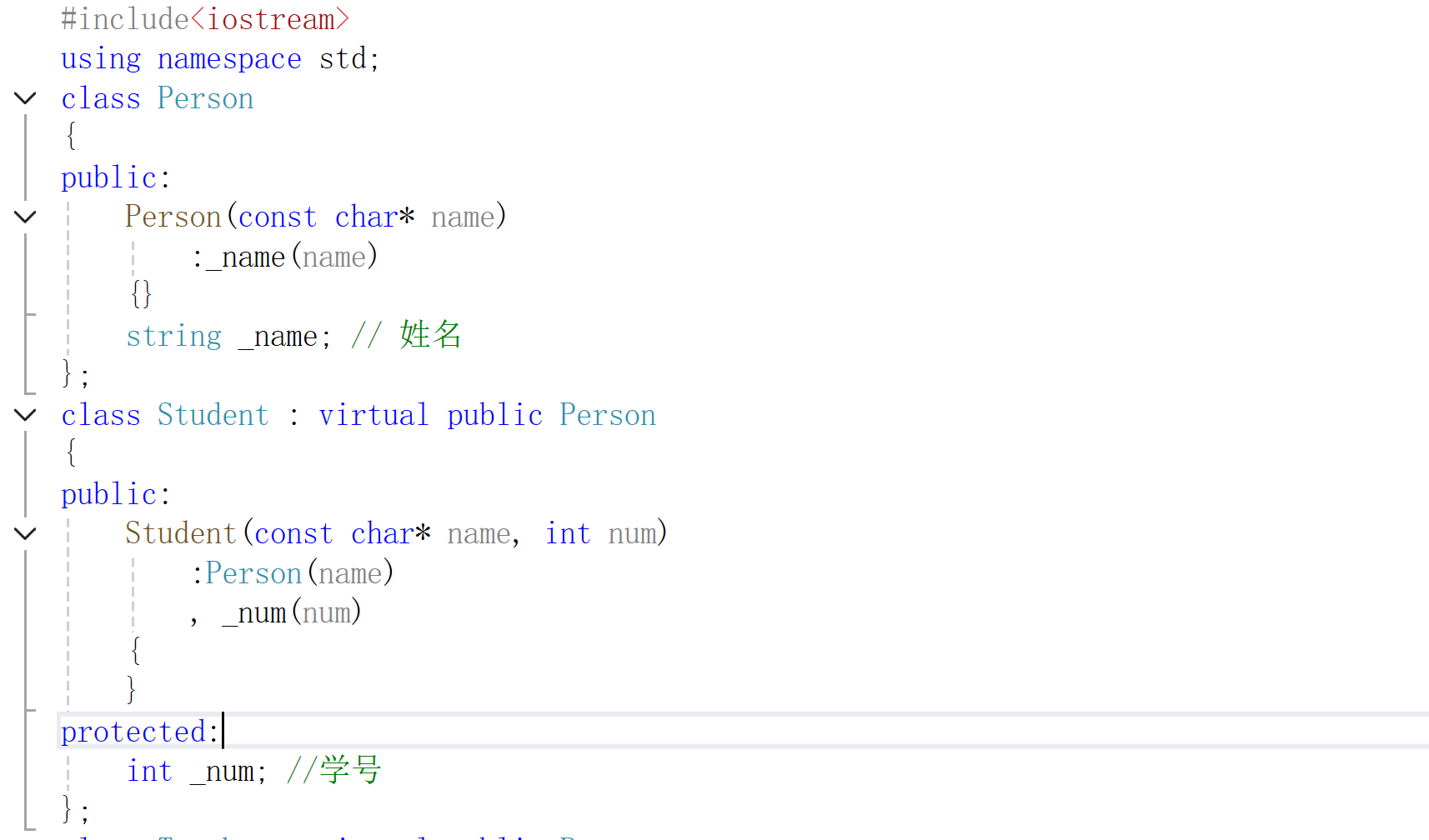 我们的person构造只在Person类中调用一次,我们调用Student和Teacher的构造的时候,就不会再调用我们Person的构造函数了。