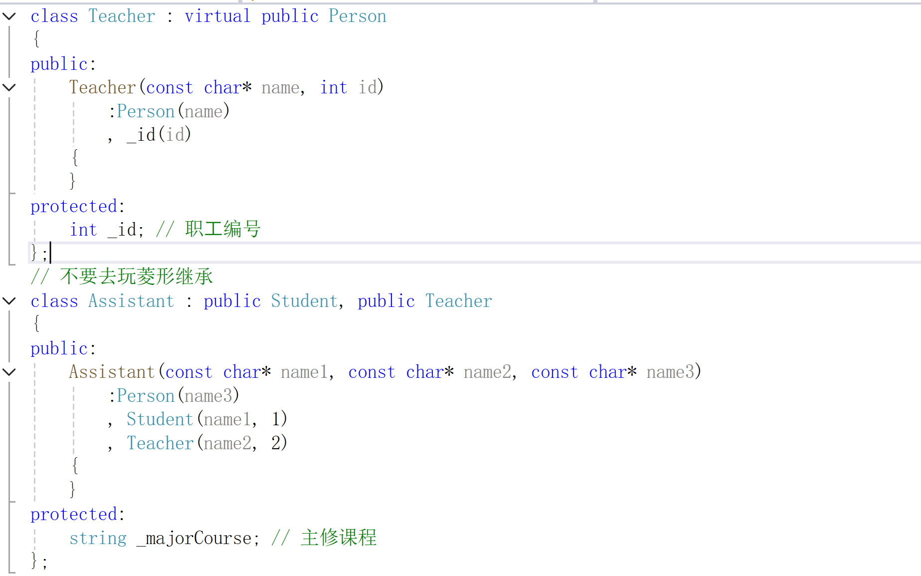 这就是菱形继承,二义性就是,我们的Student和Teacher都继承了Person的_name变量,导致,我们实例化Assistance的时候,访问_name此时就会出错了,不知道访问的是Student的还是Teacher的,此时就出现了二义性,就需要指定类域的方式解决了。