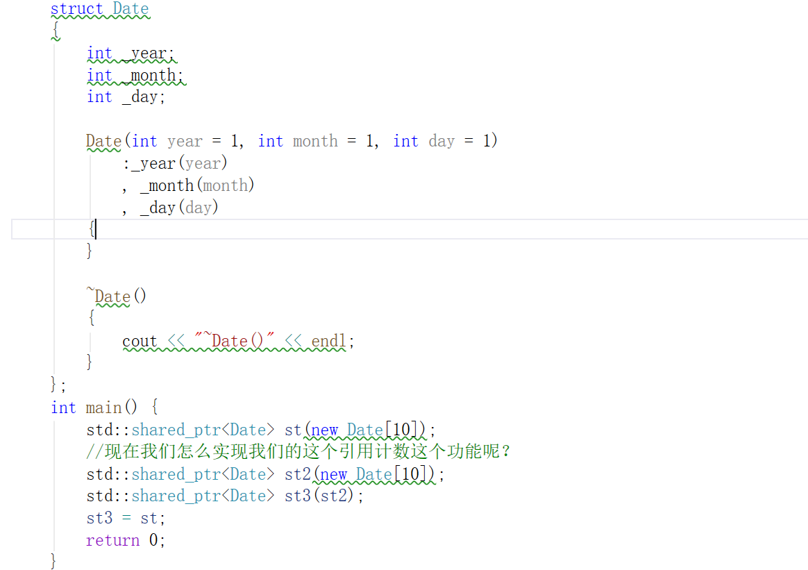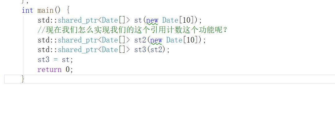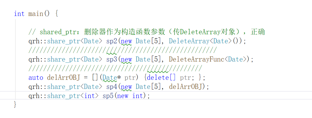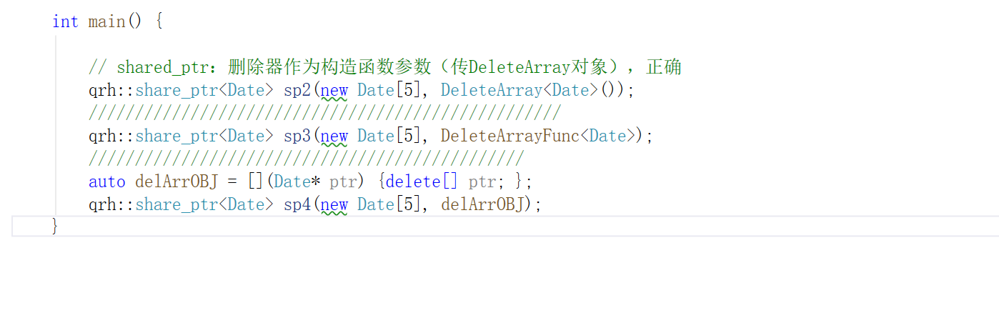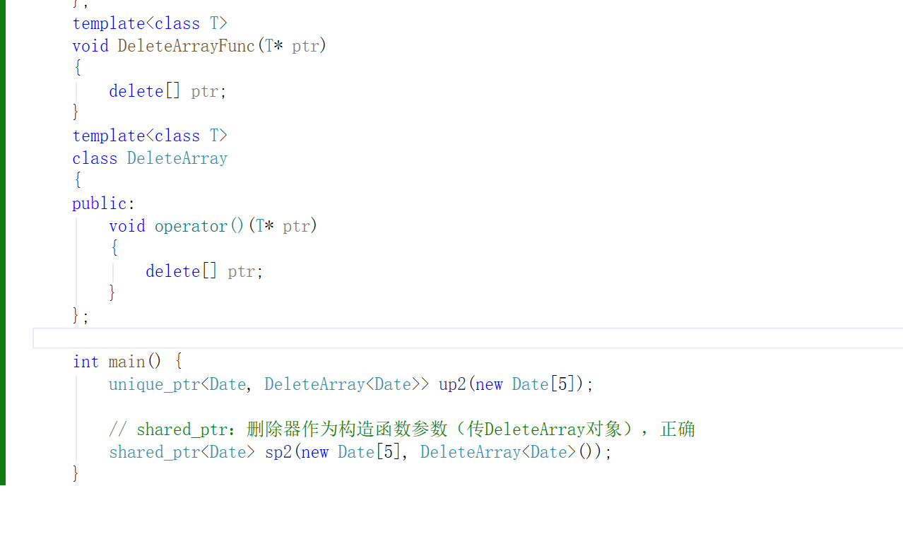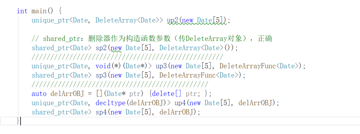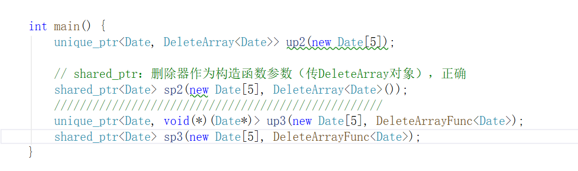在智能指针析构时就会调⽤删除器去释放资源。因为new[]经常使⽤,所以为了简洁⼀点,unique_ptr和shared_ptr都特化了⼀份[]的版本,使⽤时 unique_ptr<Date[]> up1(new,Date[5]);shared_ptr<Date[]> sp1(new Date[5]); 就可以管理new []的资源。