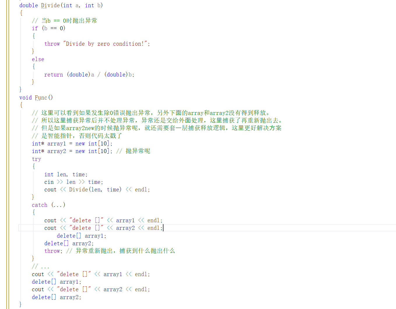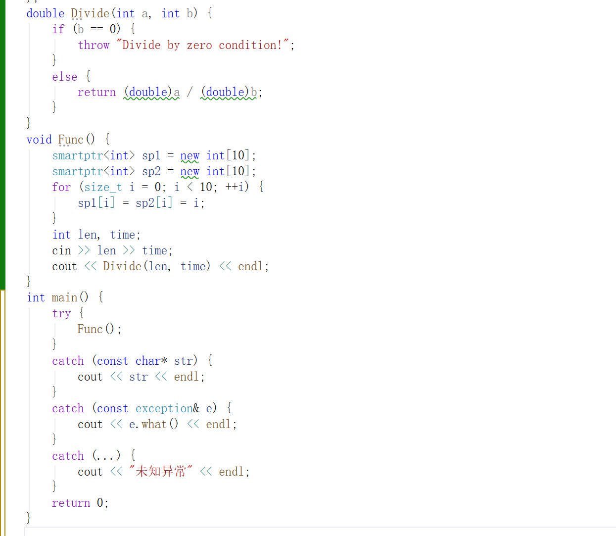 下⾯程序中我们可以看到,new了以后,我们也delete了,但是因为抛异常导,后⾯的delete没有得到 执⾏,所以就内存泄漏了,所以我们需要new以后捕获异常,捕获到异常后delete内存,再把异常抛 出,但是因为new本⾝也可能抛异常,连续的两个new和下⾯的Divide都可能会抛异常,让我们处理起来很⿇烦。智能指针放到这样的场景⾥⾯就让问题简单多了。