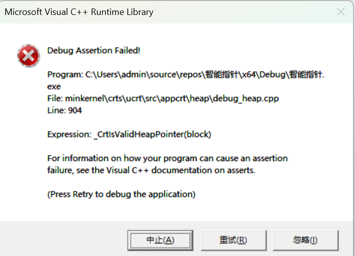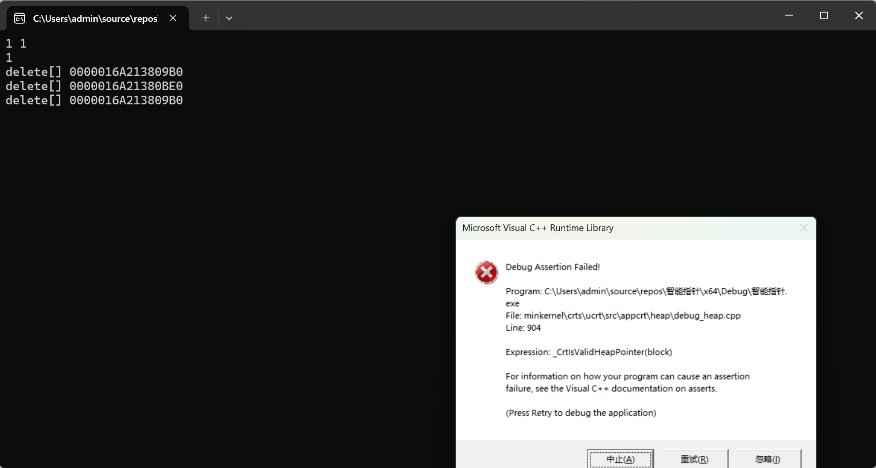 此时程序终止了,就是一块内存被释放两次了,这是这里很不舒服的地方。