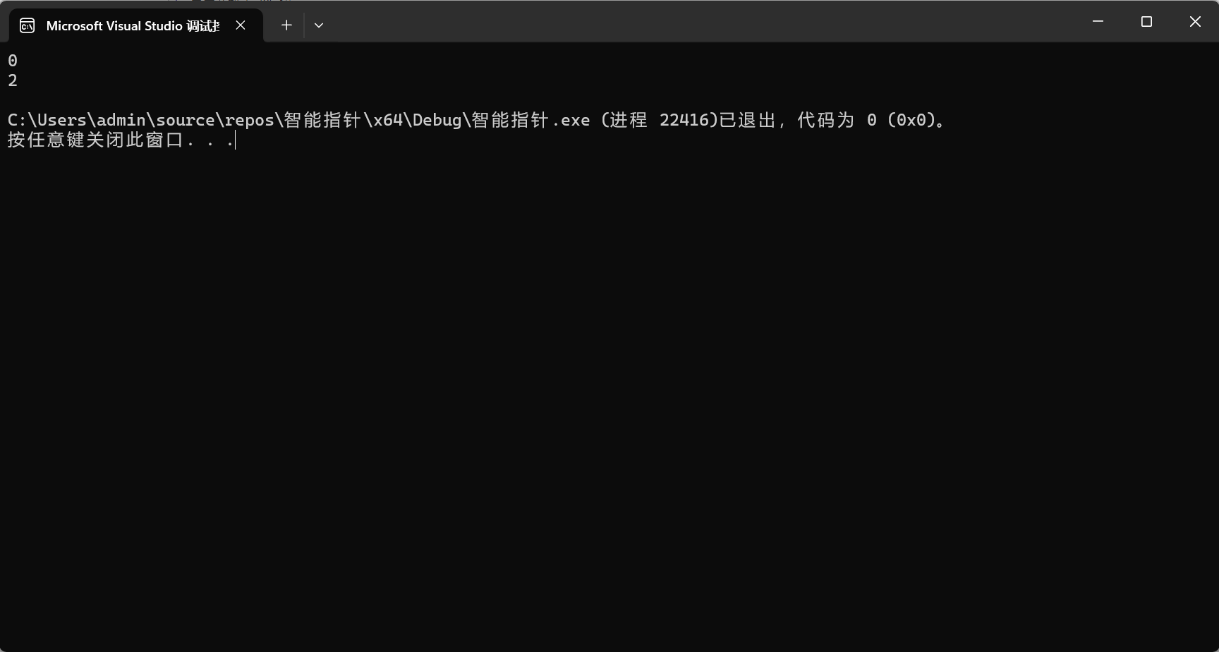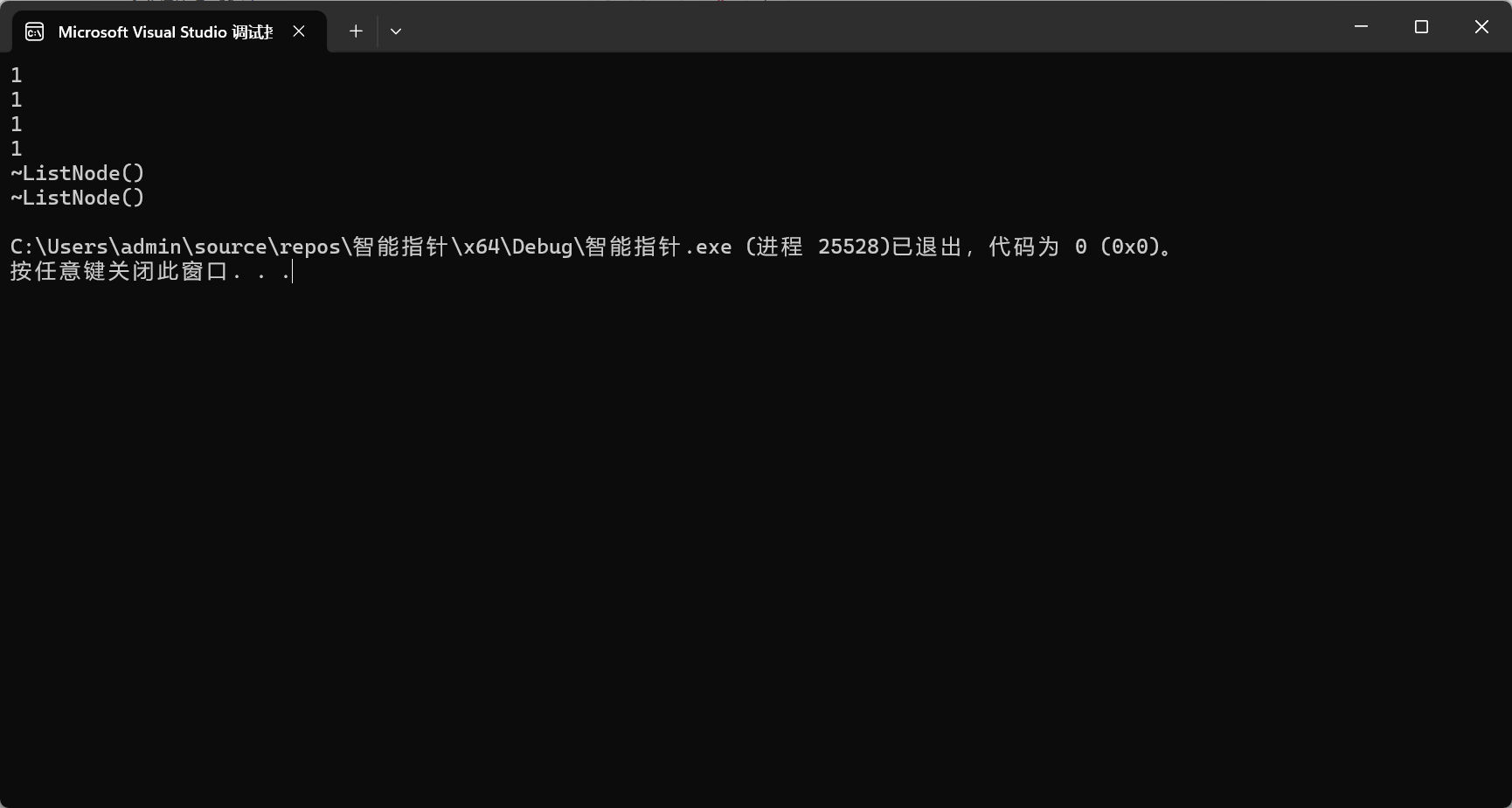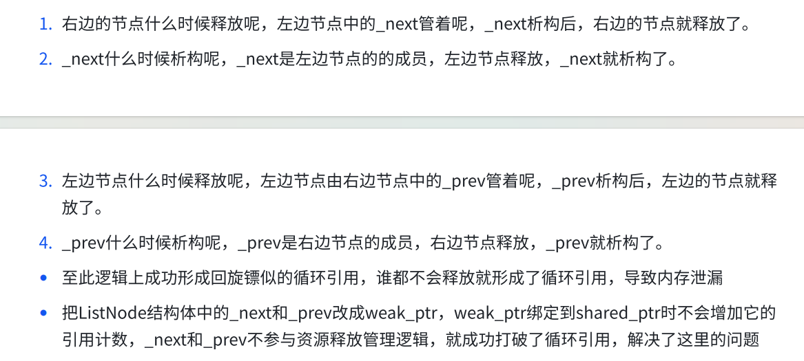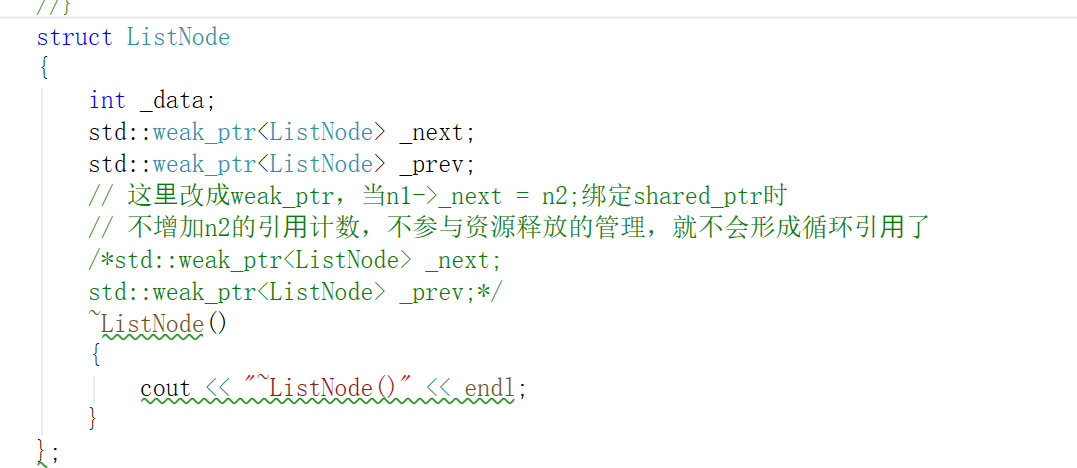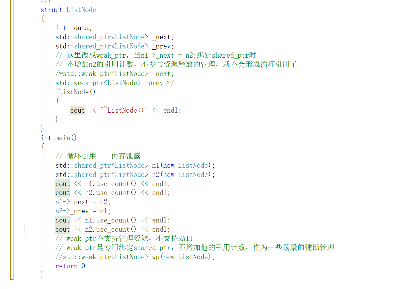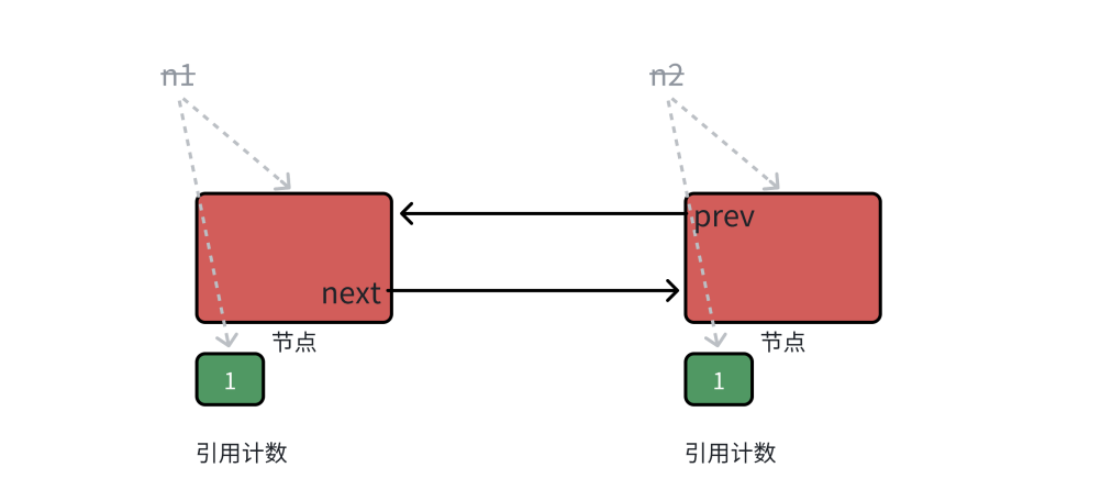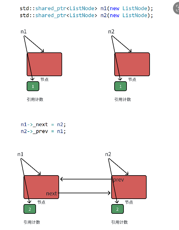 n1和n2初始引用计数都是 1(各自管理自己的ListNode);n1->_next = n2→n2的计数变成 2(被n1和自身持有);n2->_prev = n1→n1的计数变成 2(被n2和自身持有);- 程序结束时,