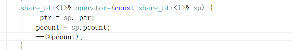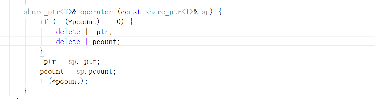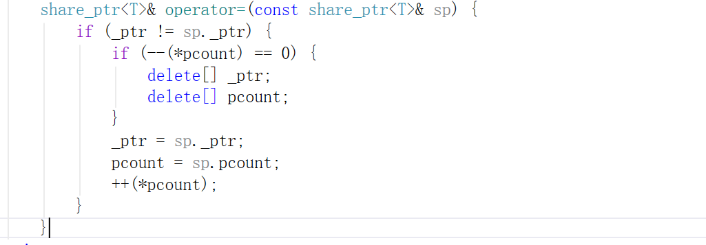 我们想到赋值,可能就会这样直接写一个赋值,就是把你=右边的_ptr和pcount都给我然后再++即可,这样是错误的,因为你赋值是给一个已经存在的对象赋值的,所以,你需要赋值的这个对象可能就他自己指向一块空间,此时你让它指向别处,此时不就出现内存 泄漏了吗,所以还要判断一下。