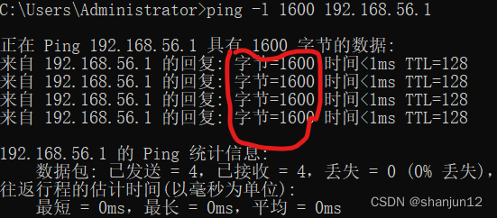 -l:参数可以设定ping包大小.一般情况下,ping包的大小有32字节,有时为了检测大数据包的情况,可以使用参数改变ping包大小,如图,ping包的大小为1600字节: