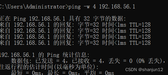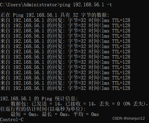 基本命令的使用:-t :参数会一直不停地执行ping,在Windows操作系统中,默认情况下发送4个ping包,如果在ping命令后面加上参数 “-t”,如下图示,系统会一直不停地ping下去:按"Ctrl + C’即可停止