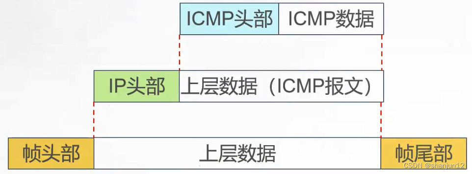 ICMP属于网络层协议(也有高于网络层的说法),因为传输ICMP信息时,要先封装网络层的IP报头,再交给数据链路层,就是ICMP报文对应IP层的数据,如图: