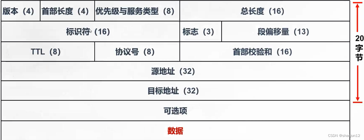 2.数据封装的时候在网络层会封装ip地址的头部,形成ip数据包 。IP数据包格式(分为20字节的固定部分,表示每个ip数据包必须包含的部分,和40字节的可变长部分。