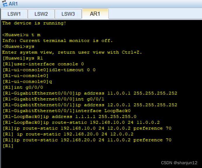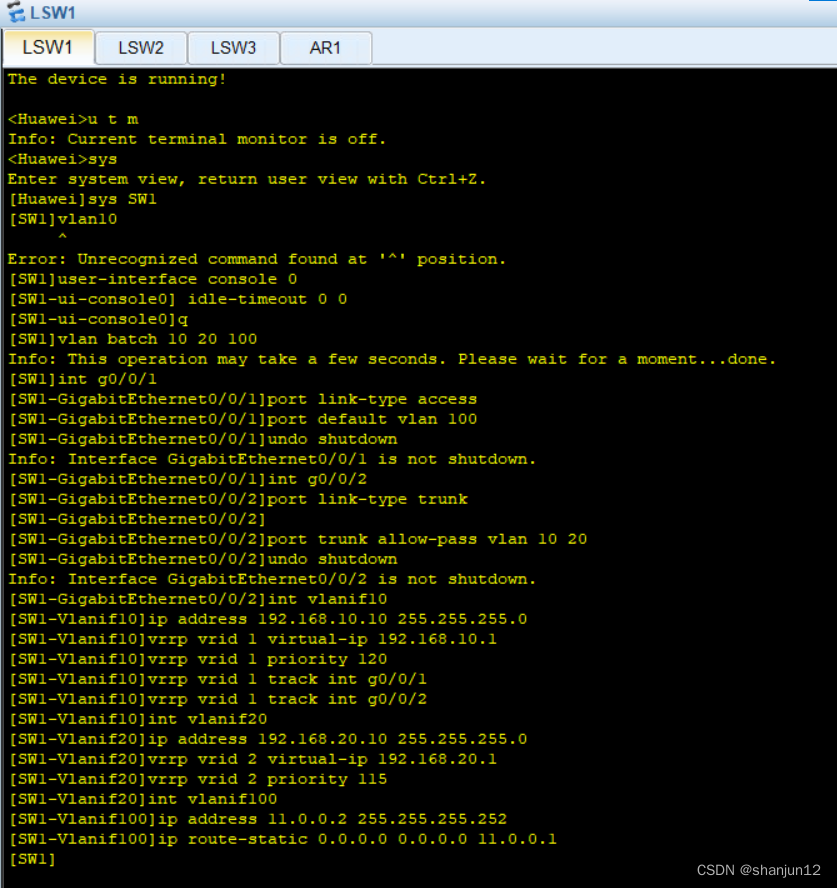 VRRP决定哪个路由器是Master ,Master路由器负责接收发送至用户网关的数据包并进行转发,以及响应PC对于其网关lP地址的ARP请求。Backup路由器侦听Master路由器的状态,并在Master路由器发生故障时,接替其工作,从而保证业务流量的平滑切换。