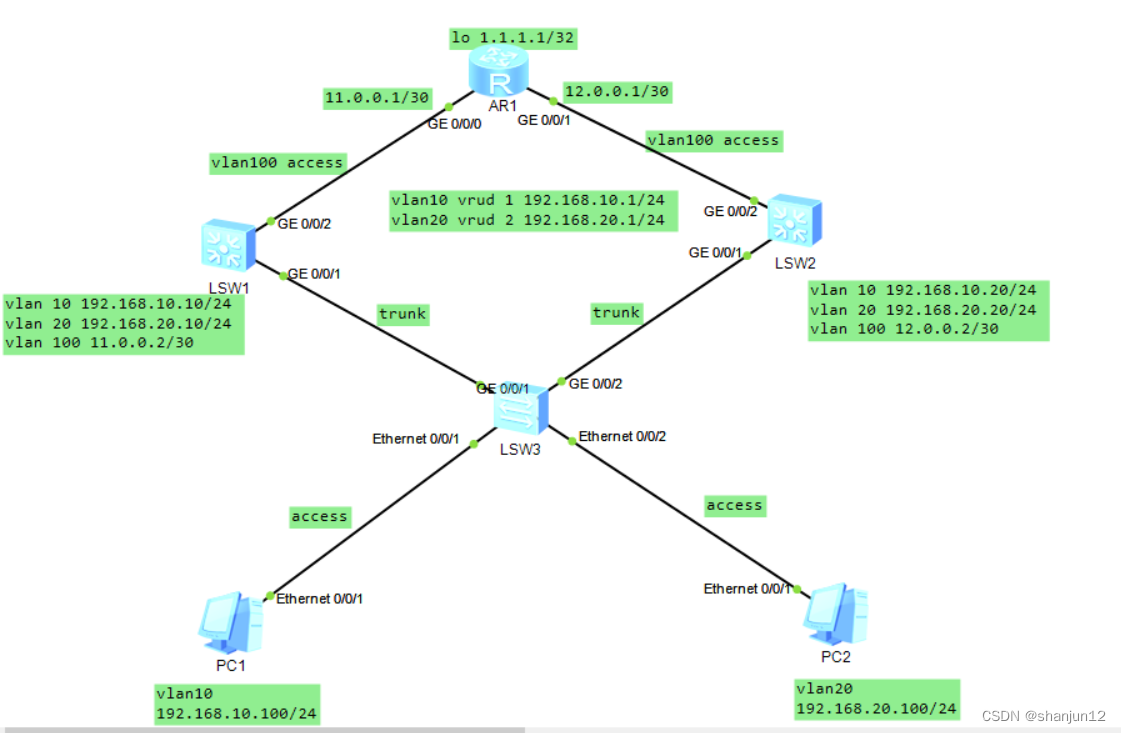通过VRRP形成的虚拟路由器使用虚拟IP地址和虚拟MAC与网络中的PC进行通信。虚拟MAC的格式如下∶最后1个字节的VRID表示虚拟路由器ID的16进制,例如VRID是1,虚拟MAC地址为00-00-5E-O0-01-0。