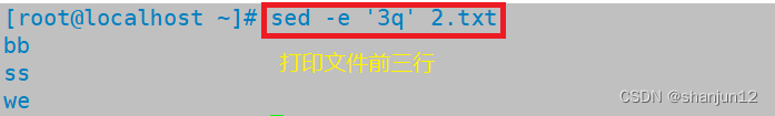 | sed -e '#q' | #代表行号 打印第1行到第#行内容 |