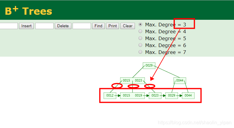 下图是一个3阶的B+树,可以通过以下网址尝试:https://www.cs.usfca.edu/~galles/visualization/BPlusTree.html
