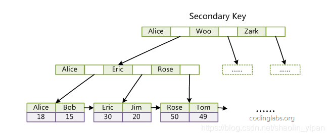 辅助索引data域存储相应记录主键的值而不是地址。换句话说,InnoDB的所有辅助索引都引用主键作为data域(如下图所示)。