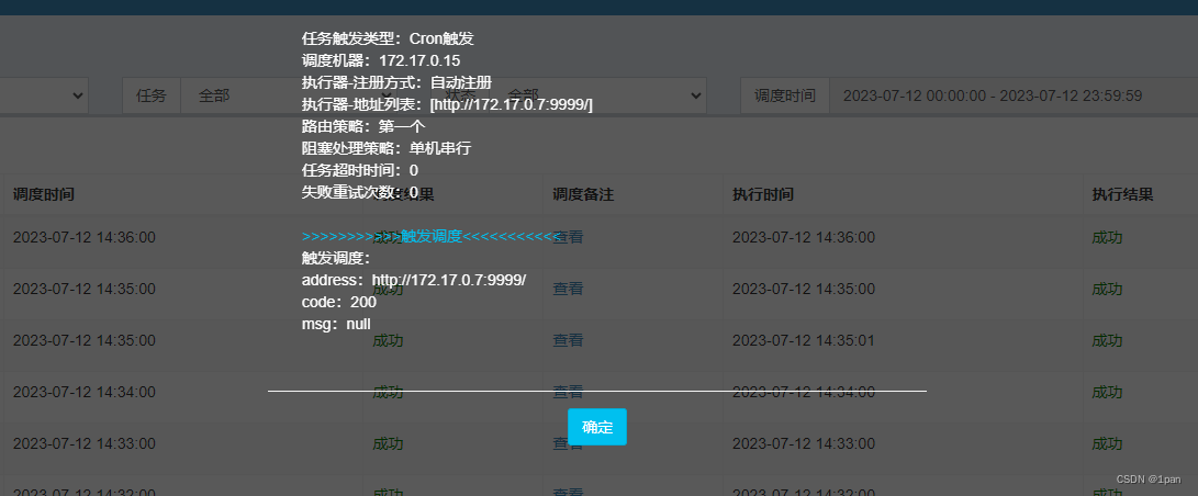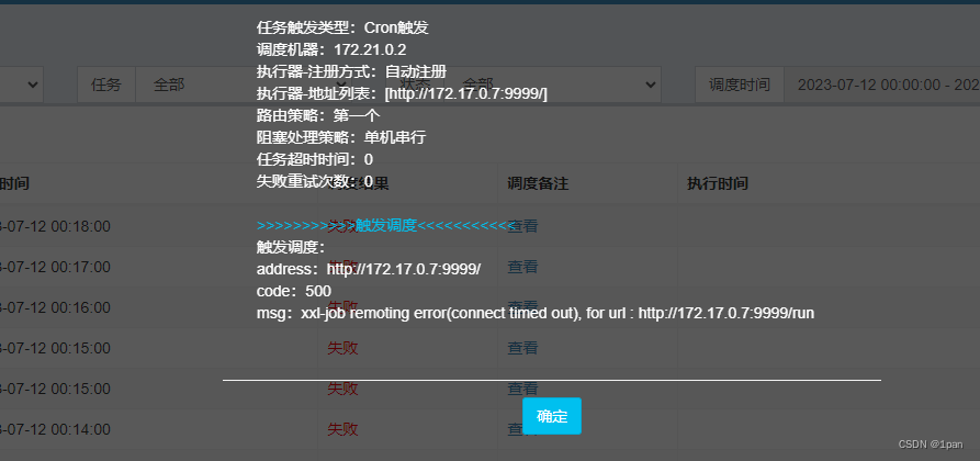 查看“调度备注”调度服务xxl-job-admin容器的ip与执行服务manager容器的不在一个网段;