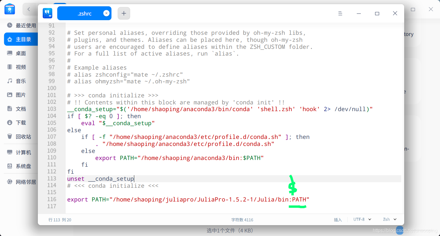 最近体验deepin20,添加julia全局环境变量的时候不小心输入错误,执行source ~/.zshrc (我将终端的shell更换成了zsh,如果使用bash的话应该是执行了source ~/.bashrc)