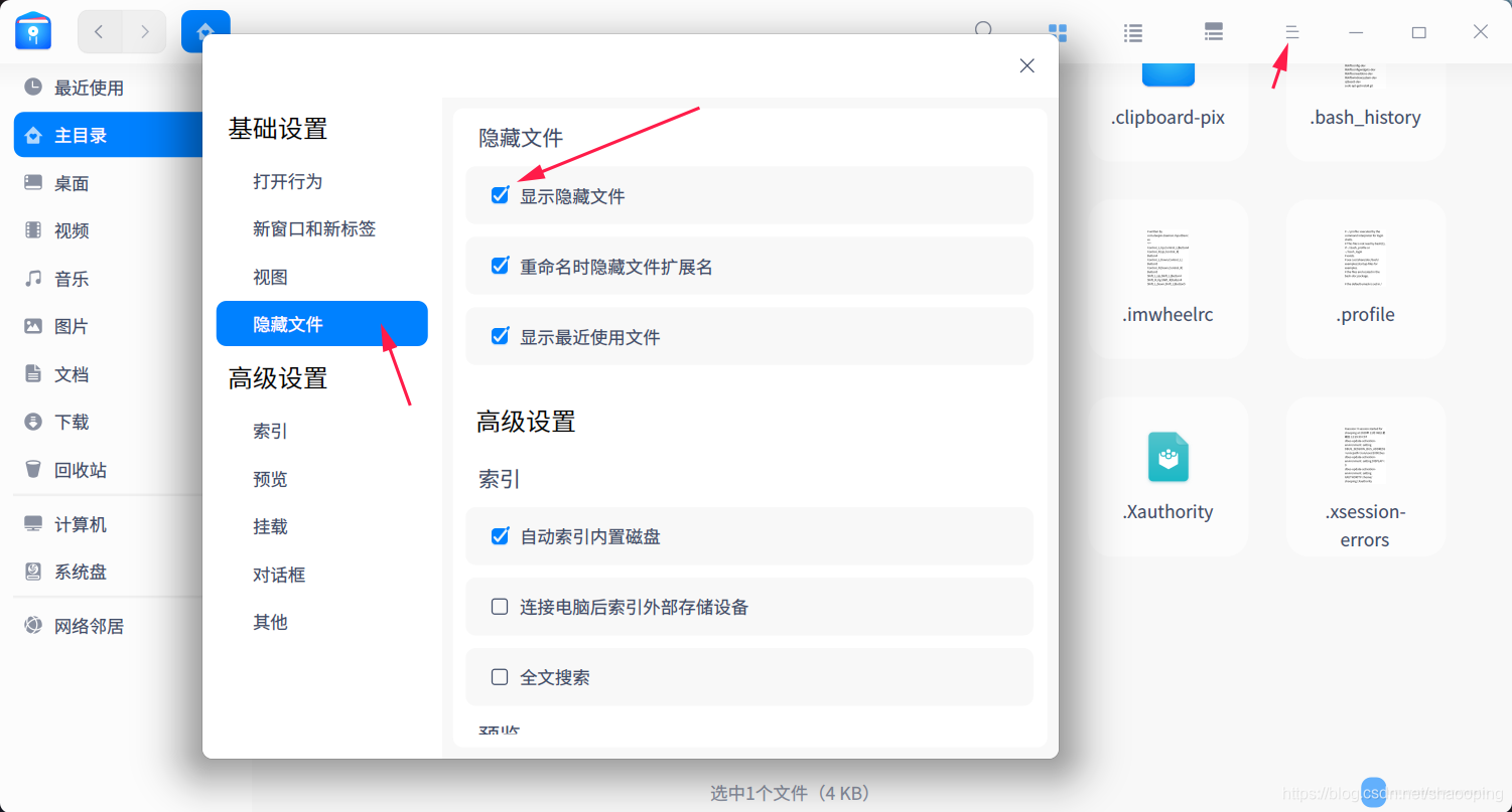 查找了一些教程,发现还是通过命令行执行,我这个就行不通了,所以就只能找刚添加变量的文件,这里/. 代表的是家目录下的隐藏文件,然后在桌面点击进入家目录,点击设置,勾选隐藏文件,找到.zshrc文件,根据自己的shell选择,如果使用的bash,修改 .bashrc文件