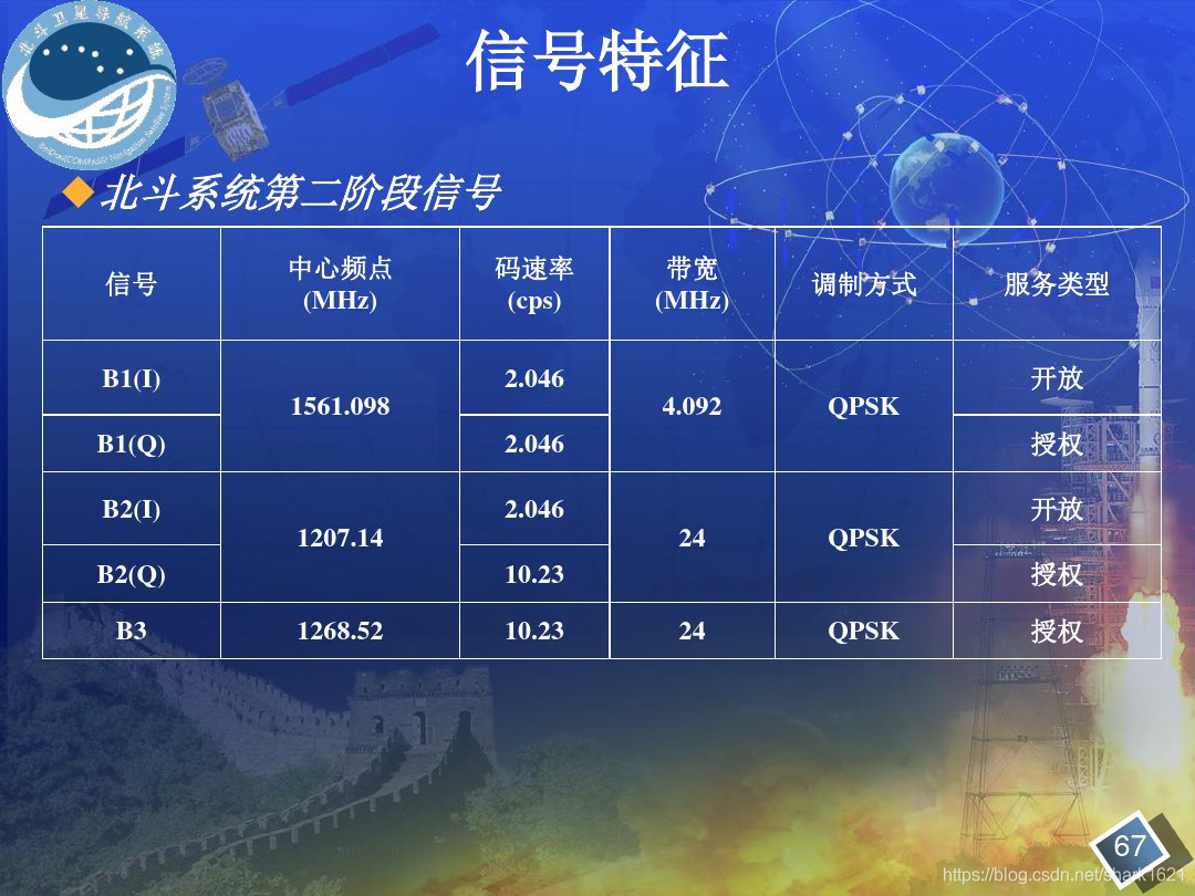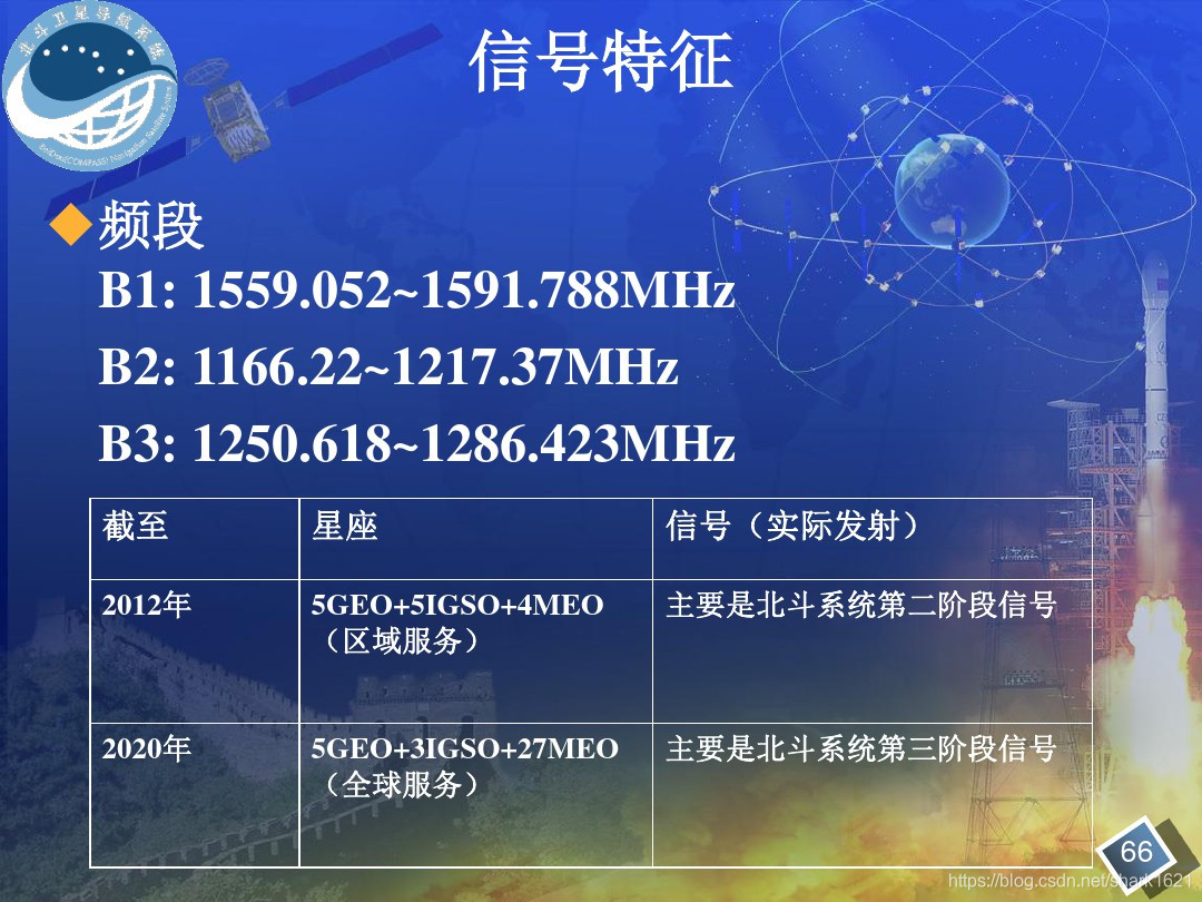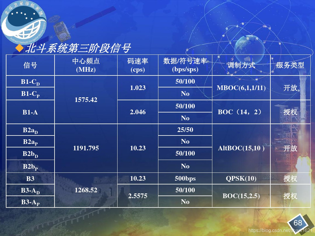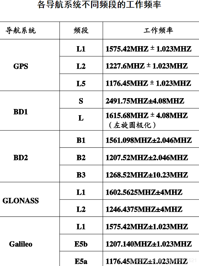 摘自世界电联 ITU-R M.1787-2 建议书 《关于在1 1641 215 MHz、1 215-1 300 MHz和1 559-1 610 MHz频段运行的卫星无线电导航业务(空对地和空对空)系统和网络及发射空间电台技术特性的说明》表 1-1
