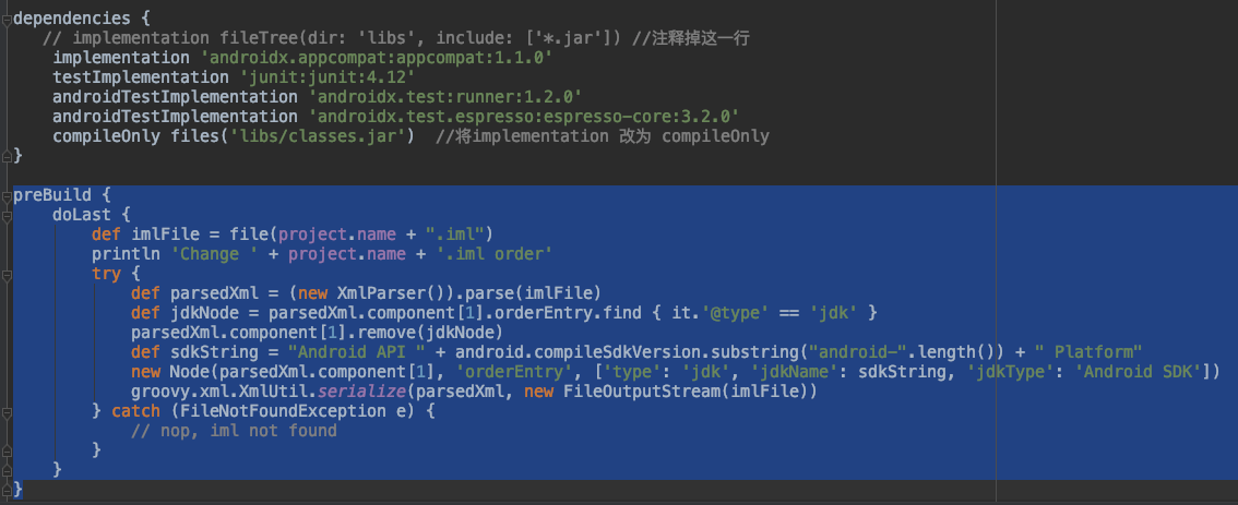 Step3.在Module的build.gradle中,dependencies自动增加依赖配置,注释掉下面一行