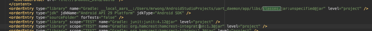 <orderEntry type="library" name="Gradle: __local_aars__:/Users/mrwong/AndroidStudioProjects/uart_daemon/app/libs/classes.jar:unspecified@jar" level="project" />
