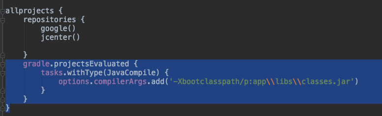 options.compilerArgs.add('-Xbootclasspath/p:app\\libs\\classes.jar')