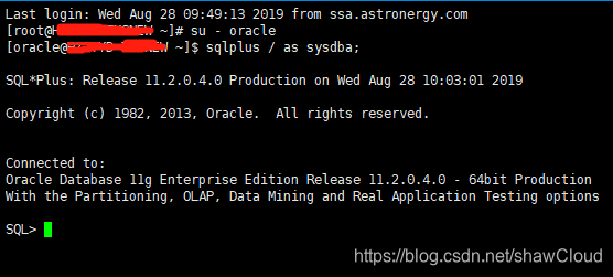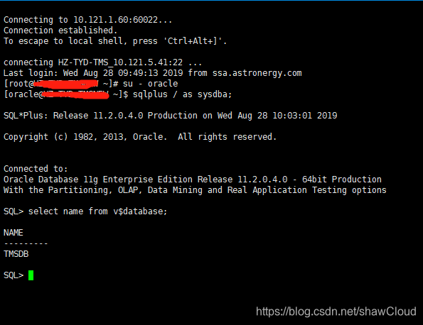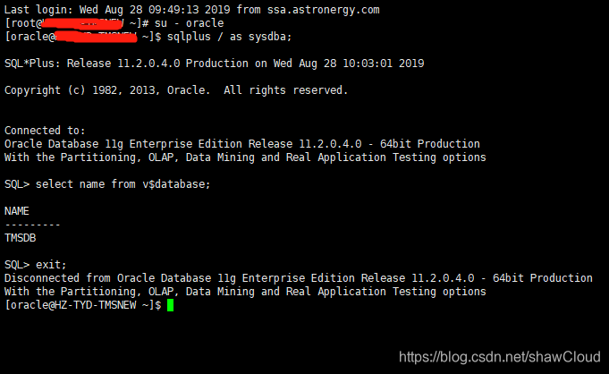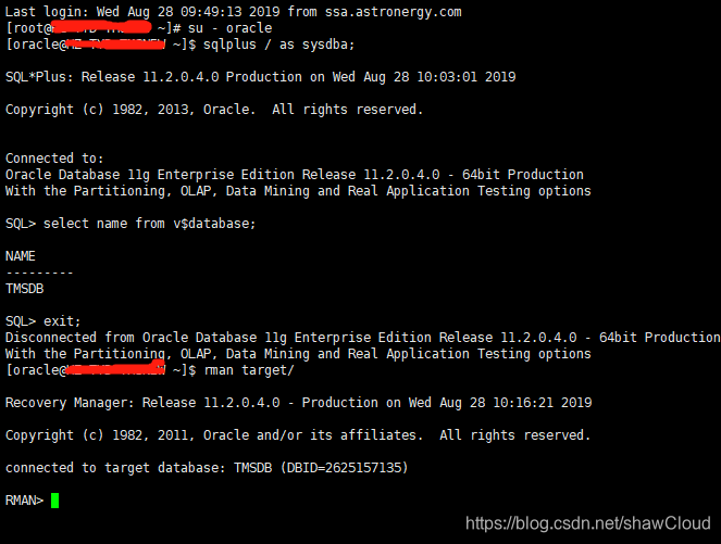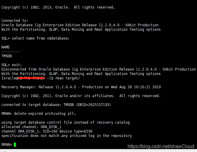 查询当前数据库的名称,看看是否是你所要操作的数据(特别是一台机器上装了两个Oracle数据库的,强烈建议看一下操作的数据库,楼主这里就是清除归档日志时没有看,结果清除错了数据库,还好有同事的帮助,找到了问题。)