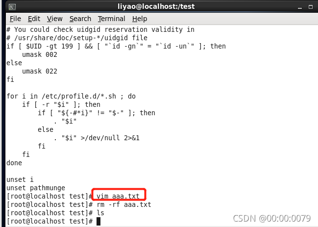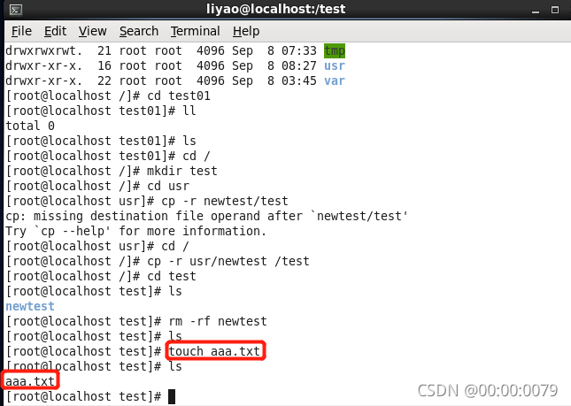 示例:在test目录下创建一个空文件 touch aaa.txt