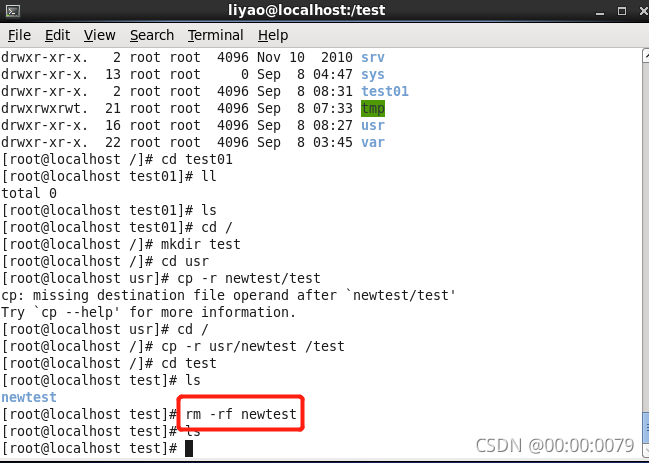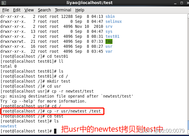 示例:将/usr下的newTest拷贝到根目录下的test中,使用cp -r /usr/newTest /test